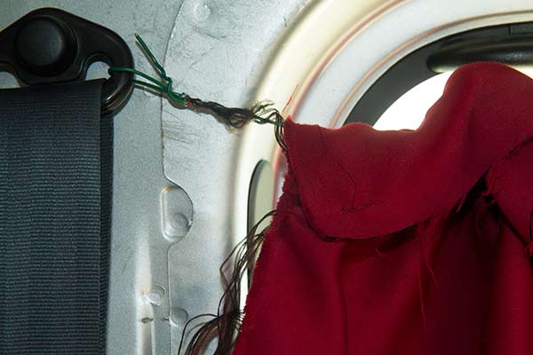 Attention, deux années de suite, la ceinture de la place du milieu s’est bloquée: on ne pouvait plus relever la banquette arrière. Il a fallu employer une solution extrême: couper la ceinture. Remplacer la ceinture de sécurité, ce n’est pas donné! La parade consiste à tirer une bonne longueur de ceinture puis de bloquer l’enroulement de la ceinture avec deux pinces à linge.