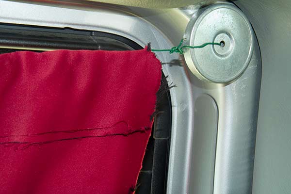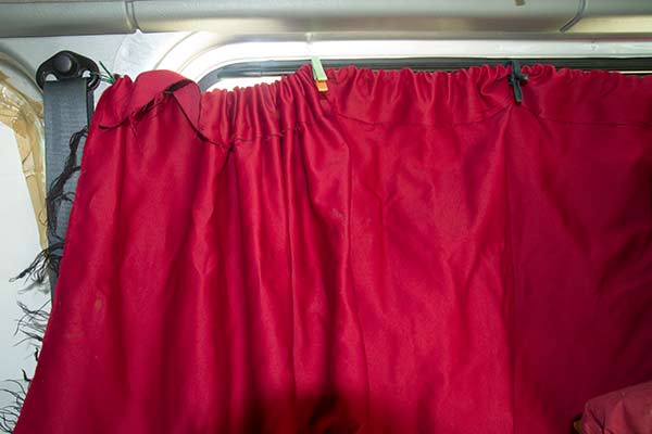6. On a installé des rideaux sur le côté du fourgon avec un système D très primaire mais qui fonctionne très bien et c’est bien l’essentiel. On a acheté du tissu isolant. On a découpé le tissu selon les dimensions de la fenêtre. On a récupéré du fil de fer. On a enroulé et cousu le tissu pour faire passer le file de fer. On a attaché les extrémités du fil de fer d’un côté sur le haut de la ceinture et l’autre sur un gros aimant. En journée, on rabat le rideau de l’autre côté avec l’aimant qu’on colle à la paroi! Voilà! Pas de prise de tête et ça dure dans le temps!