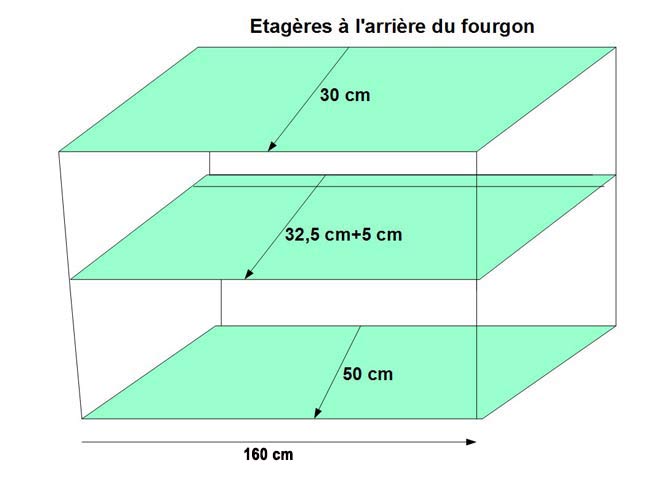 A la demande de Yannick dans les commentaires, je rajoute les plans du fourgon aménagé avec les cotes.