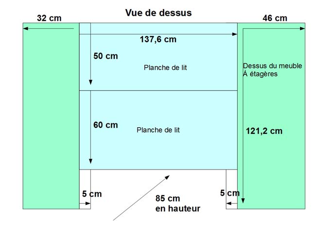 Merci pour le commentaire! Je m’occupe des cotes ce WE et les mettrai sur l’article. On met les planches de couchages sur le dessus du meuble étagère de devant avec les matelas pliables par dessus. On fixe l’ensemble avec des grosses sangles.