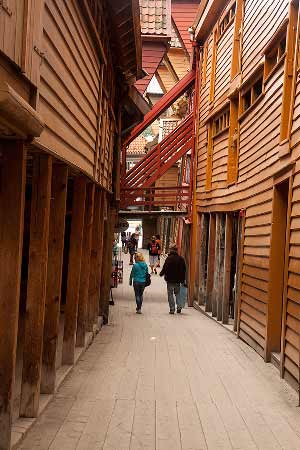 Le comptoir de Bergen est devenu prospère surtout grâce au commerce de morue (du cabillaud séché en provenance du nord de la Norvège). On découvre l’organisation typique de cette habitation-atelier – entrepôt.
