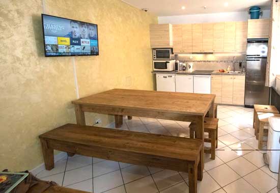 - Appartements avec, selon le logement, TV, coin salon, coin repas, kitchenette avec frigo, lave-vaisselle, machine à café, bouilloire électrique