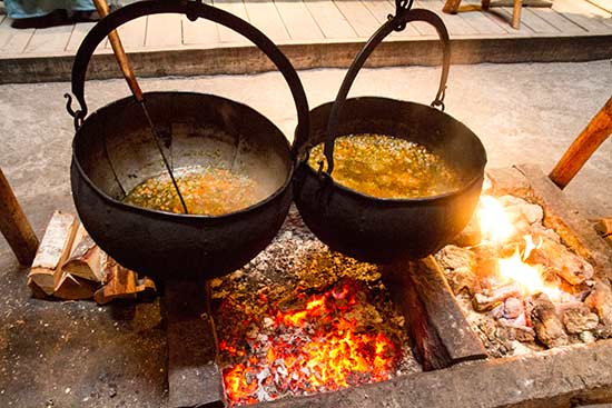 Notre pièce préférée, la salle de banquet avec au centre son âtre et ses marmites où mijote une soupe. On vous conseille vivement de vous y rendre pour le déjeuner : pour une somme modique, on a pu déjeuner dans la maison du chef! Au menu de ce repas viking, une soupe délicieuse relevée avec des herbes accompagnée de pain et de crème onctueuse, le tout arrosé d’hydromel. Un régal!