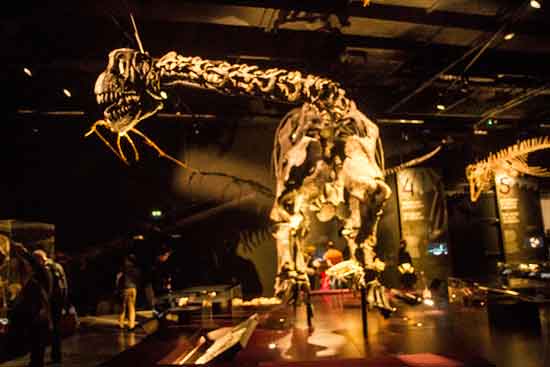 On découvre le clou du musée des Confluences, le squelette d’un camarasaure, un dinosaure géant, long et haut de 4,5 m avec quelques griffes encore accrochées aux membres. Des oeufs fossilisés sont exposés au pied du dinosaure. Un autre dinosaure est suspendu au plafond, gueule béante, comme prêt à fondre sur sa proie. On découvre les bois gigantesques d’un megaloceros, une sorte de cerf en 4 fois plus gros.