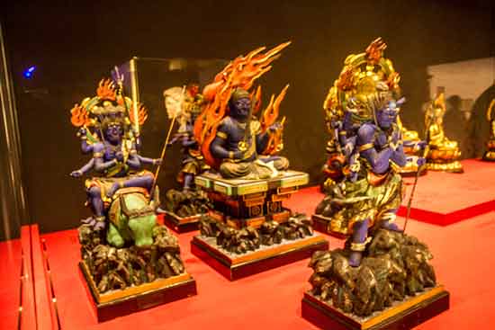 On démarre notre visite du musée des Confluences par l’exposition temporaire au premier étage consacré aux voyages d’Emile Guimet et à sa riche collection ramenée de ses expéditions en Asie. De nombreuses statues de dieux hindouistes et bouddhistes sont exposées. Un très impressionnant groupe de démons bleus en flamme et aux regards féroces côtoient des bouddhas imperturbables assis sur leur lotus. De nombreuses statuettes de temples sont alignées dans les vitrines.