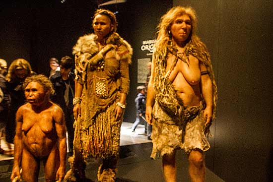 On commence en toute logique par la salle des origines. Dès l’entrée, on se retrouve face à un groupe de 3 femmes: 3 statues en cire très réalistes qui représentent 3 espèces d’hominidés, la femme Florès, la femme néandertalienne et la femme sapiens.