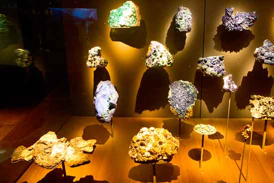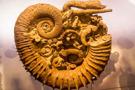 Dans une pièce attenante, on approche le squelette d’un mammouth. Tout autour sont exposés des fossiles dont de magnifiques ammonites géantes.Deux têtes de dinosaure sont exposées: il est possible de les toucher et de tâter leurs crocs.