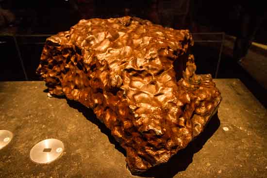 La suite de l’exposition aborde les origines de manière plus scientifique. On peut voir plusieurs spécimens de météorites, dont un gros bloc de rocher roue -brun. Un film de 9 minutes avec une sphère devant l’écran explique les origines et la formation de notre planète.
