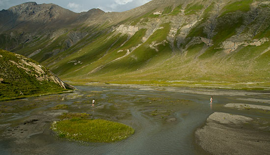 On descend le long d’un sentier très rocailleux, très raide dans un paysage très minéral. On longe un lac avant de nous poser longuement plus bas au bord d’un ruisseau, les pieds dans l’eau. Oui, c’est possible même à la montagne ! L’eau est glaciale mais ça ravigote !