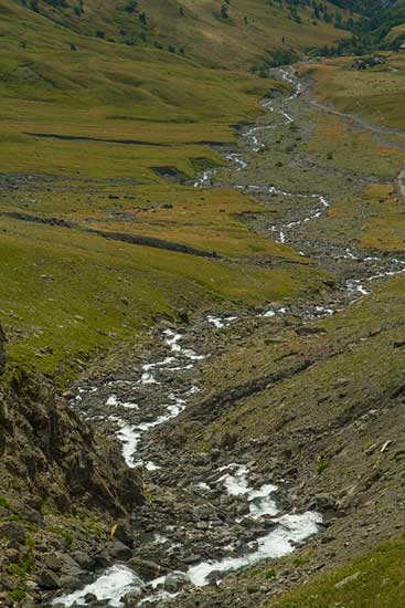 L’avancée paraît d’autant plus longue qu’on voit au loin les traces du sentier qui se faufile au fond du vallon. Peu à peu on prend de la hauteur. La rivière a resurgi et son flot nous apporte un peu d’air frais providentiel. Il règne une chaleur caniculaire. Des nuages d’orage s’amoncellent au-dessus du massif des Ecrins. Le torrent se déploie comme des veinules et irrigue le vallon.