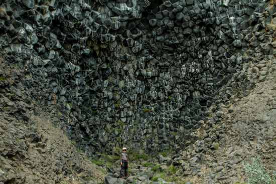 Après le parking, on part sur la droite et atteint un champ de colonnes basaltiques. Jusqu’à présent, on en voyait dans des zones localisées. Ici, elles émergent de partout, sculptent un paysage très particulier, unique. On approche un immense voûte tapissée de ces colonnes qui forment comme des écailles de poisson.