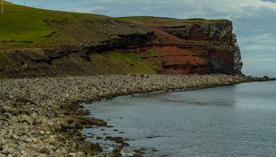 Depuis la ferme, on aperçoit les étonnantes falaise rougeoyantes où nichent les colonies d’oiseaux. Pour se rendre aux falaises, on avance sur un sentier qui longe le littoral.