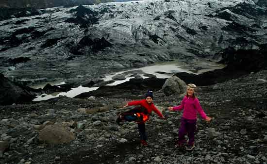 C’était la randonnée imprévue en Islande à presque minuit. Pour la première fois les enfants ont pu marcher sur un glacier! Une marche de 20 minutes environ permet d’approcher ce très beau glacier hérissé de pics noirâtres.