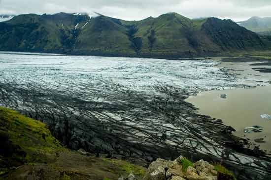 Depuis le centre d’information du camping de Skaftafell, on monte au point de vue de Sjonarsker. Depuis ce point de vue, on surplombe une langue du glacier Vanajokull, plus grand glacier d’Islande. Très belle vue sur le glacier prolongé de son lac glaciaire dans lequel flottent quelques icebergs.