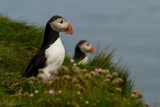 Pause pique-nique dans la baie en compagnie d’une colonie de mouettes piailleuses. On repart vers la droite en direction d’un autre col. On redescend de l’autre côté vers un autre parking que le nôtre. pendant que papa randonneur file chercher le fourgon au parking du matin, on se dirige au bout du fjord: on va voir les macareux qui festonnent les falaises.