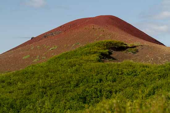 On entre un peu plus loin dans une vaste grotte de lave, la grotte de Kikja. On poursuit la rando à travers des murailles de colonnes de basalte droites, arquées.Après avoir traversé ce champ de lave surréel, on se dirige vers une autre montagne connue pour une autre particularité géologique: elle est teinte d’une couleur rouge foncée très soutenue.