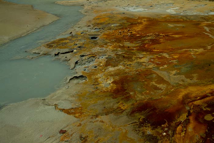 On se balade d’abord sur le site de Hverir en contrebas, la partie très touristique. On voit une terre en éveil: marmites de boue bouillonnante, fumerolles qui fusent comme une cocote minute, une palette de couleurs où se mêlent jaune dorée, vert, orange et rouge.